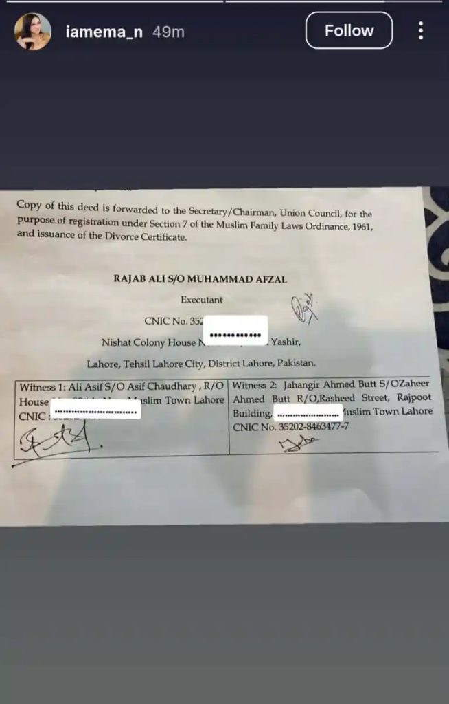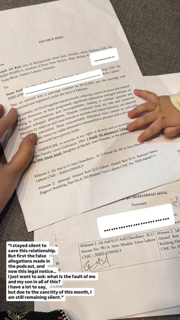 Meanwhile, Emaan Fatima shared her own reaction through social media. She posted that Rajab Butt had sent her a legal notice regarding divorce and expressed her pain over the situation.
