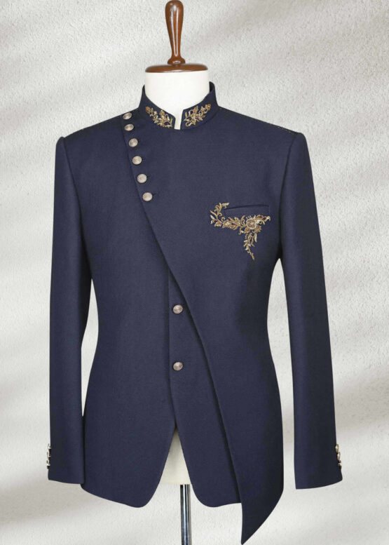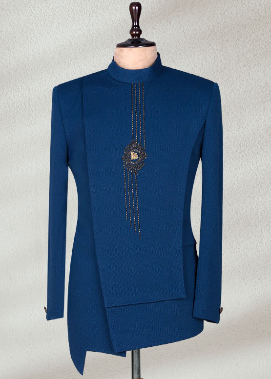 Royal blue angle cut prince coat if you want to make a bold statement. This design with a stylish front cut with detailed embroidery and a modern look. It’s a good choice for weddings and special events, and you look unique.